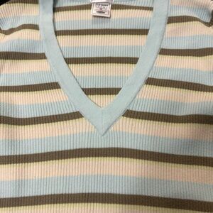2 piece bundle 20%off 3 piece bundle 30%off Stylish striped V-neck sweater with pastel colors. Perfect for casual wear.