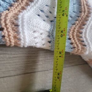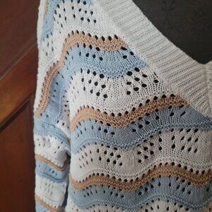 Striped Wave Knit Cotton Sweater V-Neck White/Blue/Tan Womens XL Studio 1886