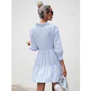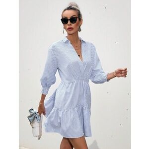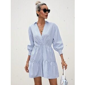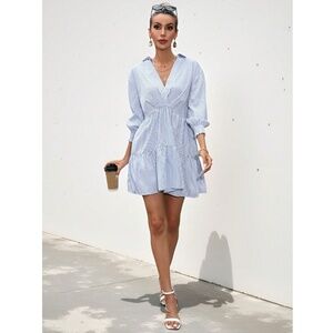 Striped White Blue Mini Dress Ruffle Detail V-Neck 3/4 Sleeve
