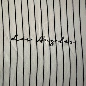 DENIM & FLOWER White t-shirt with black stripes and 'Los Angeles' print. Size Large