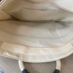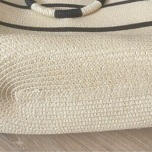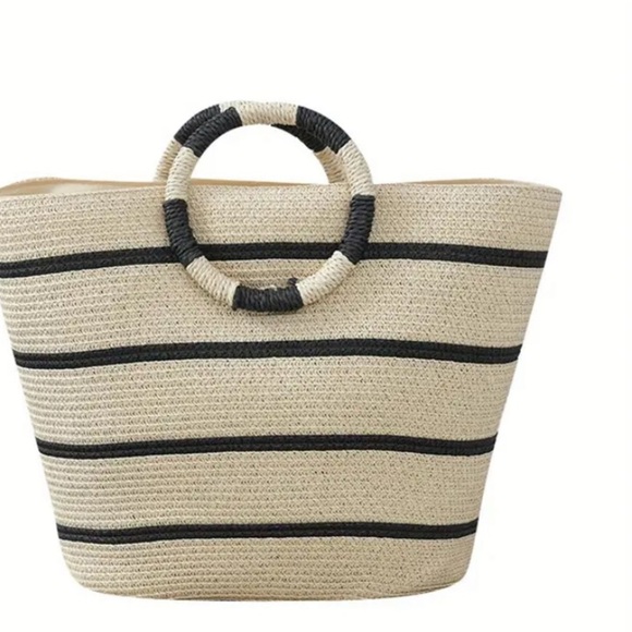 Stylish and versatile, this striped woven tote bag is perfect for any occasion. Featuring a chic black and tan design, it adds a touch of elegance to your outfit. Ideal for daily use or a day at the beach.