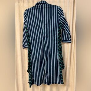 Stylish tunic dress with blue and white stripes. Features a unique polka dot pattern in green and black. Perfect for casual outings.