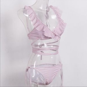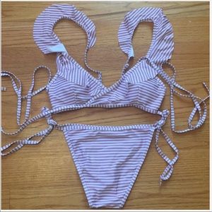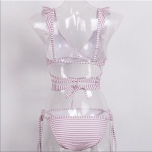 NEW striped bikini. Pink and white and comes wit cute ruffles on the top. Ties up on sides and in the back. Top is padded. No trades