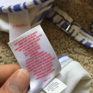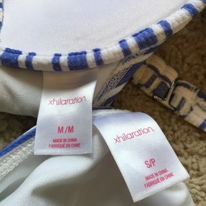 Blue striped bikini swim suit. Top is medium bottoms are small. Really cute but outgrew it really fast so only wore a couple of times. From target. No stains or flaws. Textured. I got it because it reminded me of some retro bikinis. Adjustable straps with about a cup C. Built in pads with slight push up.