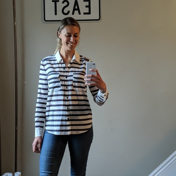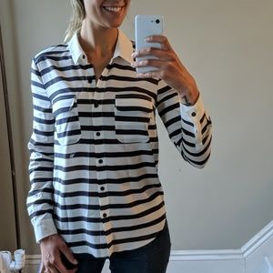 In great condition! Button up blouse with black and white stripes. Slightly sheer (as you can see in close up) but not see-through. Lightweight and comfy. Looks great dressed up or more casual.