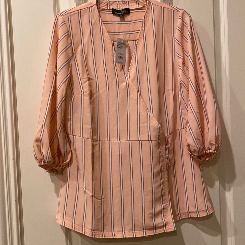 Pale pink striped blouse. Stripes are white and wine. 3/4 puff sleeves. NWT