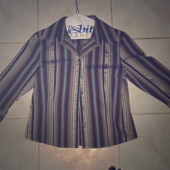 A beautiful spectrum of brown and grays on a 3/4 sleeve button down blouse.