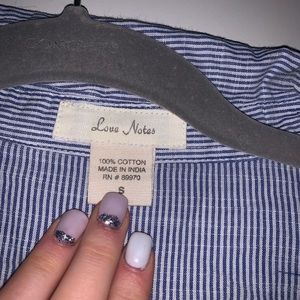 Navy and white striped button down. I wore for work. Shirt is either from TJ MaXX or Marshall’s.