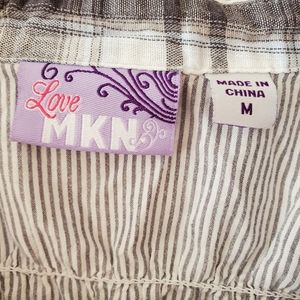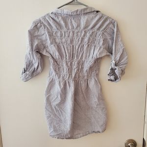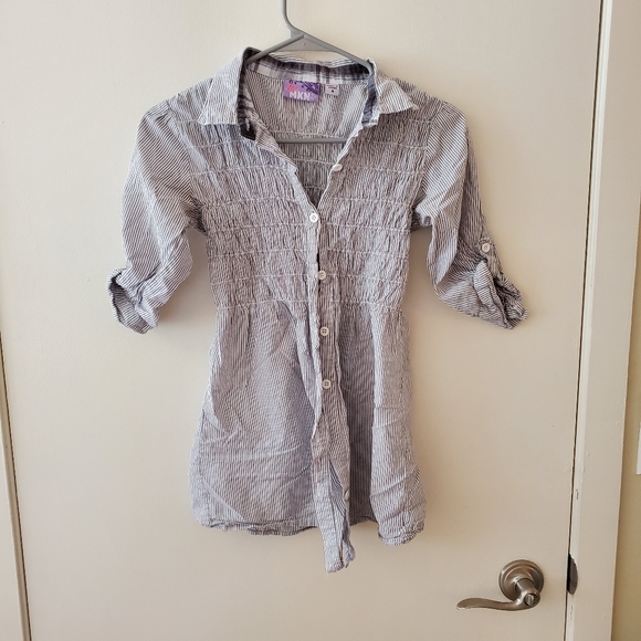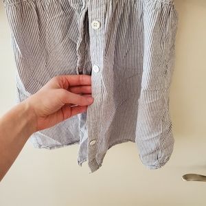 Very cute/flattering shirt. It is missing a button near the bottom, honestly it's not too noticeable. The picture with my thumb in between buttons is where the missing one should be. It's white with gray striped, no stains. Fits small.