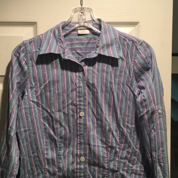Ladies fit blue, purple and green stripes button up. Vertical stripes are very flattering! Has stretch and pleats so very feminine
