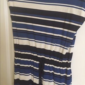 Blue, black and white striped dress. Casual. Drawstring at waist. Knee length.