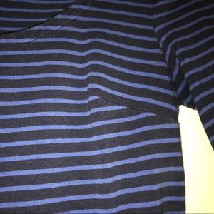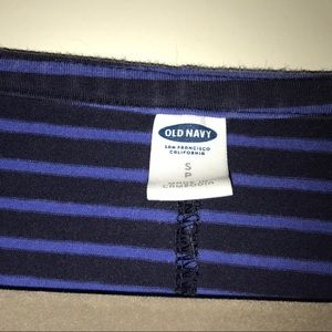 This Old Navy dress is striped medium blue and darker blue, has flattering princess seams, and elbow-length sleeves. Fit and flare. Size Small. Like-new condition!