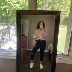 Super cute off one or both shoulder (up to you!) too! This is such a statement top! This is a silk material so super comfortable! It has ties at the sleeves so you don’t have to worry about it falling down onto your hands!