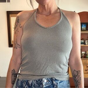 This sleeveless halter top from American Eagle Outfitters features a fitted silhouette that hugs the body, crafted from a ribbed knit material in a refreshing green hue. Its sleek design makes it a versatile addition to any wardrobe, perfect for layering or wearing on its own.