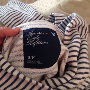 Super soft + warm dark blue and white stripes. Turquoise and distressed lettering.