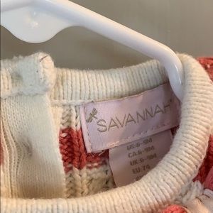 Pink and cream striped dress with button closure in back. No snags in knitting and in excellent condition. Looks great with a pair of tights!