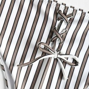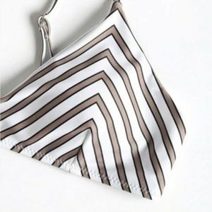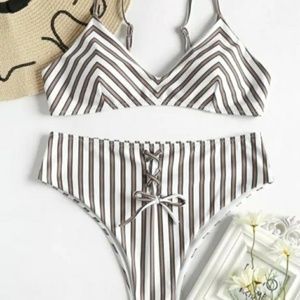 Striped high-waist bikini set, beige and black stripes on white background. Spaghetti strap padded bra top, high cut high waist lace front bikini bottom. Poly spandex blend fabric, metal closure. New with tags and waterproof storage bag!