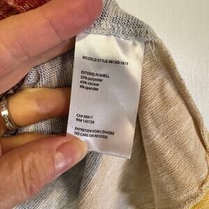 Fun and comfortable casual sweater cardigan. Polyester blend with stretch. Easy wash and wear. Excellent condition. Looks great with jeans and dress pants.