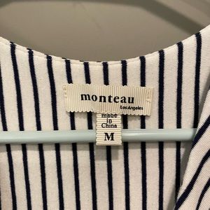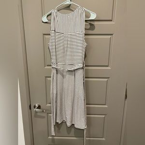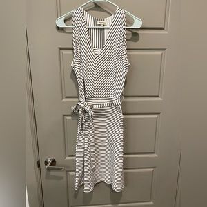 Black and white striped dress, size medium. Dress has a tie to help define your waist and is slightly fitted through the bust, waist, and buttocks. Very flattering style. Lightweight stretchy fabric. Falls just above the knee