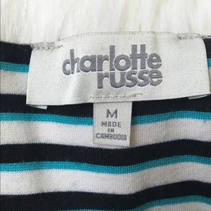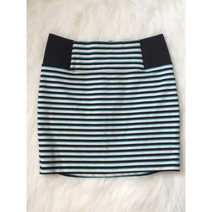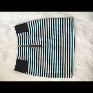 This cute stripped mini-skirt has close aqua, white and black horizontal stripes and a zipper down the back. Size: M, Brand: Charlotte Russe.