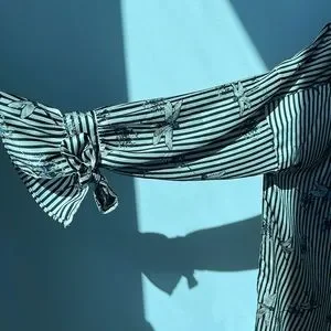 Oversized button-down featuring chic stripes adorned with intricate dragonfly and dandelion designs. Complete with a stylish wrist tie for added flair.
