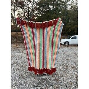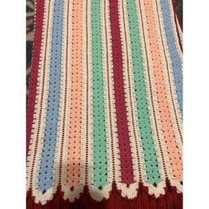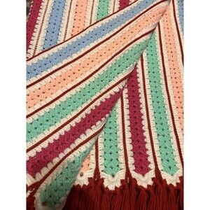 Vintage crochet afghan. Striped pattern. Pastel blue, green, pink, peach bordered with cream. Dark red accents and fringe. Approx 44” x 58”. Excellent condition. No stains. grandma core, cottage core, vintage, Rosanne Core. Obtained from an estate sale.