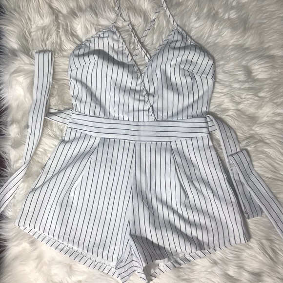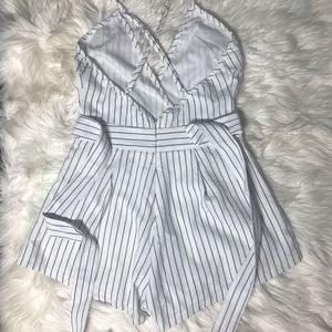 Brand new, never worn, Romper/ playsuit (no tags). Top part runs a little big. Ties at the back. Can cross straps in the front or back. Short length! Looks great with denim jacket or long line blazer with knee high boots!