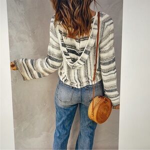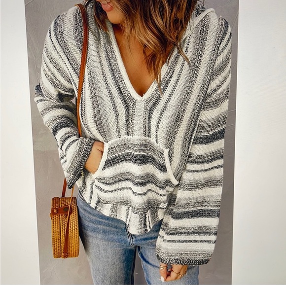 Hooded boho style pullover. Colors are white, black and grey. Texture is sweater, but it’s lightweight knit. No pulls or stains. Very comfortable fit