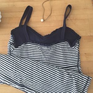 Very dainty and fitted navy and white striped tank top with ruffles. Perfect paired with shorts or jeans. Runs small. I have only worn it a few times. No flaws.