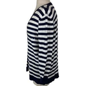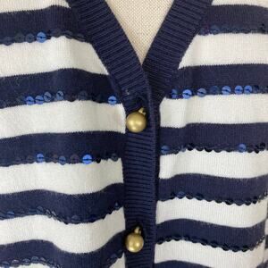navy blue white striped sequin v-neck cardigan sweater by Lark Lane. Women's XL.(last pic is similar sweater to show style & fit) Excellent pre owned condition, no stains holes or tears. 2 sequins missing on lower right front as shown in last pic. Completely unnoticeable. Thread is secured, no further loose sequins. Subtle single rows of sequins work for day or evening. Burnished gold buttons. Rayon nylon fine knit blend. Loose casual fit.
