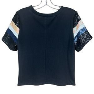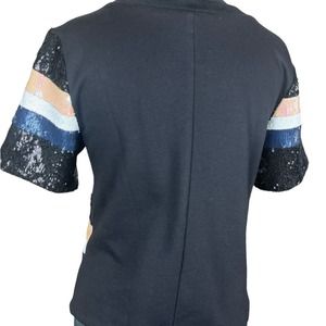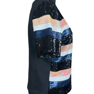 Thick jersey material back and multi color stripes on front and sleeves of sequined (black, blue, white and iridescent pink).