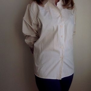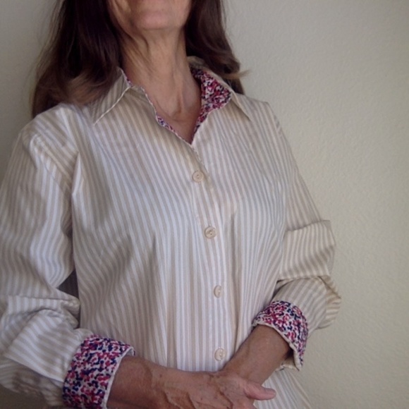 This is a cute casual, 100% cotton shirt. Tan and white stripe with blue/red cuffs. Measurements laid flat: