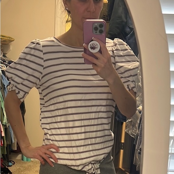 New with tag‘s striped shirt with a tie in the front. Size small shoulders are a little puffy but there is no shoulder pads in it. Has navy blue and red stripes