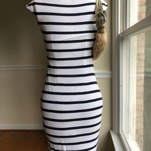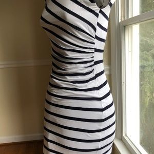 Navy/white striped dress with lining. Very stretchy fit-and-flare knee-length cut with asymmetric side ruching and cap sleeves. In great condition!