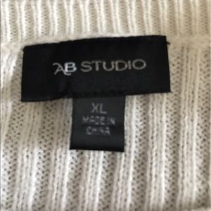 White sweater with black striped, jean bottom trim. Snug, fits long, long sleeves. Runs small. Never worn.