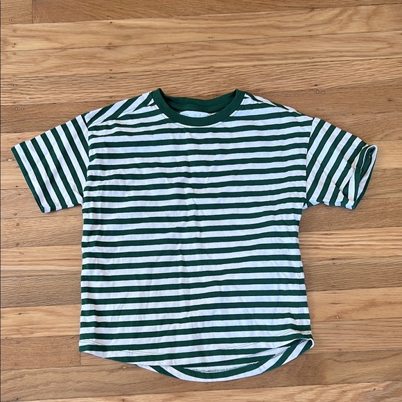 100% cotton kids t-shirt, white and green stripes. Crewneck, short sleeve, good condition with no damage or stains.