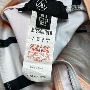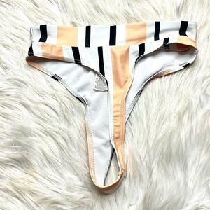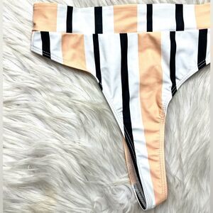 Stylish thong bikini bottoms featuring a chic striped design in peach and black.
