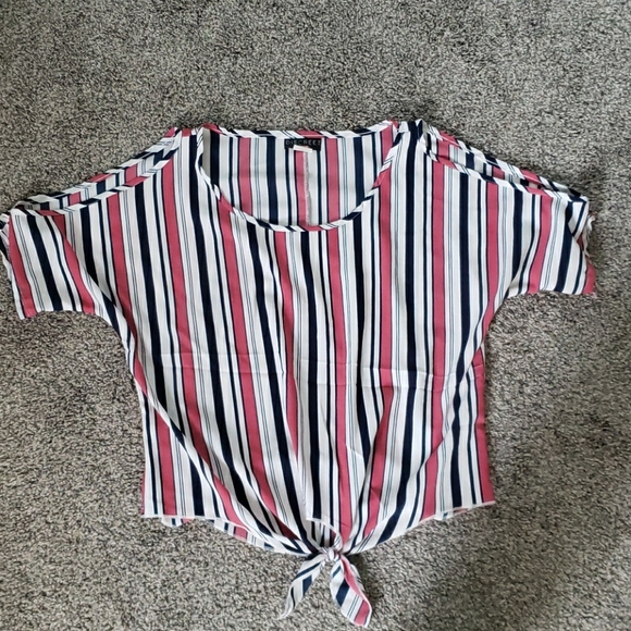 Cold shoulder, navy, white and mauve/pink striped top. Looks more red in the picture.