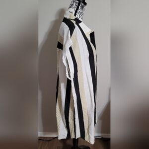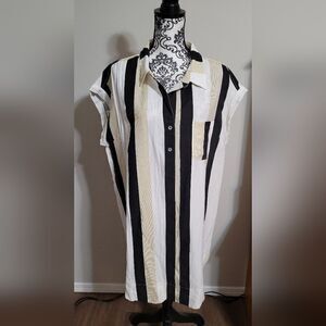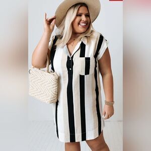 When it's time for a vacay, you'll for sure want to pack this cute shift dress featuring lightweight material patterned with vertical white, black, and neutral stripes, a single accent chest pocket, a button up bodice with a collared v-cut neckline, short sleeves with rolled cuffs, and a relaxed silhouette that falls into a straight mid-thigh length hemline!