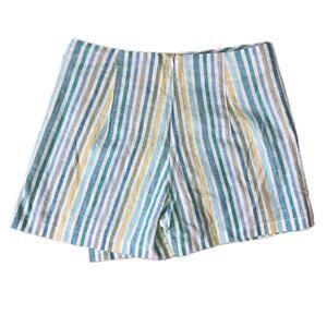 Vertical striped wrap skort, mainly white, blue and yellow colors. Lucy Love, made in USA. Nautical, coastal, mermaidcore, beachy style. Slightly sheer material. Great condition pre owned, very light amount of pilling. Size medium. Waist flat across is 15". Total length from waist to hem is 13.5". Inseam of shorts is 3".
