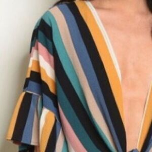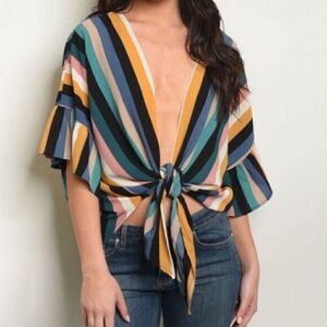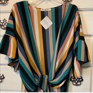 Striped Front Tie Top. Very trendy could be worn with practically anything. 98% Polyester, 2% Spandex