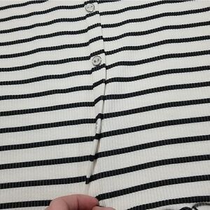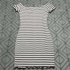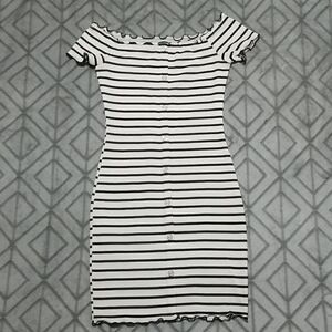 Striped Over the Shoulder Button Mini Dress. Buttons are fake. Does not open. Soft and stretchy. No tag but I'd say it fits small.
