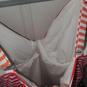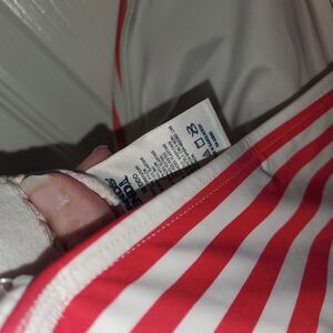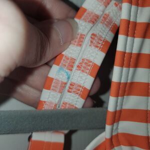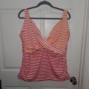 Stylish women's top featuring vibrant red and orange stripes. Perfect for casual outings or a day at the beach.