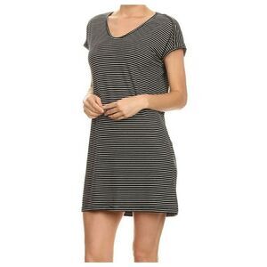 Details: Striped short sleeve tee shirt style dress with scoop neck. It has a relaxed oversized fit.
