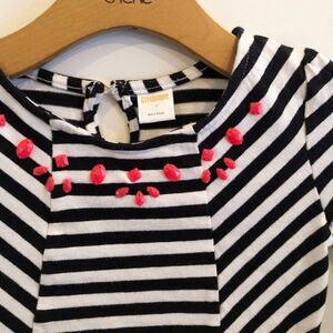 First size 6 -7 years. It’s from Gymboree brand, bottom for closure and pink stones on chest.
