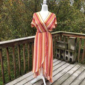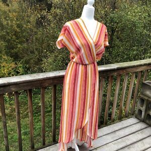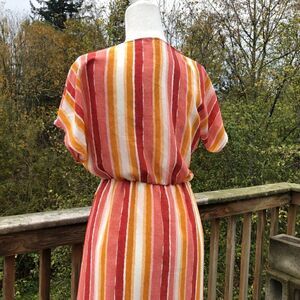 This sweet summer dress is elegant and versatile that can be styled with almost everything in your closet. The multi-toned stripes add a freshness to the midi featuring a high-low petal hemline and short flutter sleeve.