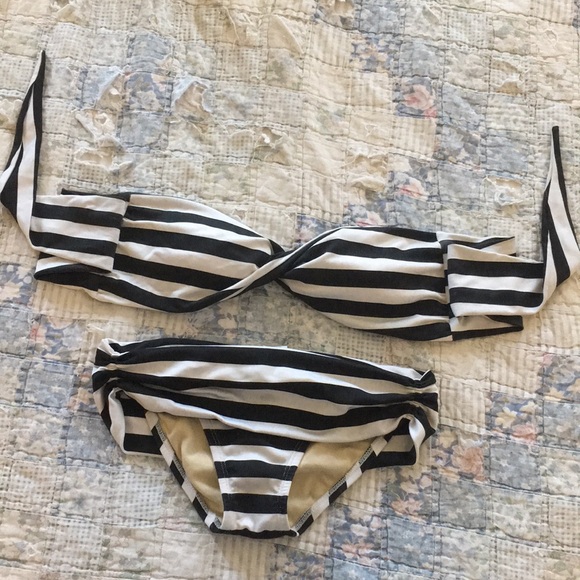 Wore once in Hawaii. Beautiful slimming bikini! The top is a small and the bottoms a medium. Just too big for me now.