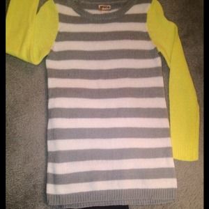 Acrylic tunic sweater goes great with leggings. Grey and white strips contrast with bright yellow sleeves.