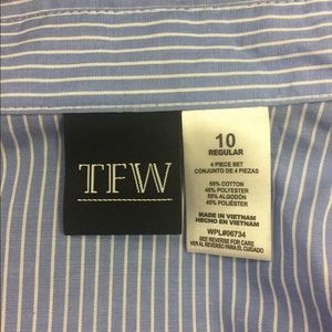 This blue and white stripped button down shirt is a size ten regular. It has cuffed sleeves and is collared.