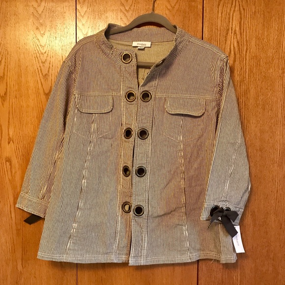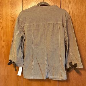 Brown and Cream vertical strips, front pockets, brown bows on sleeves, hidden eye-hooks. Easy to wear and easy to wash.